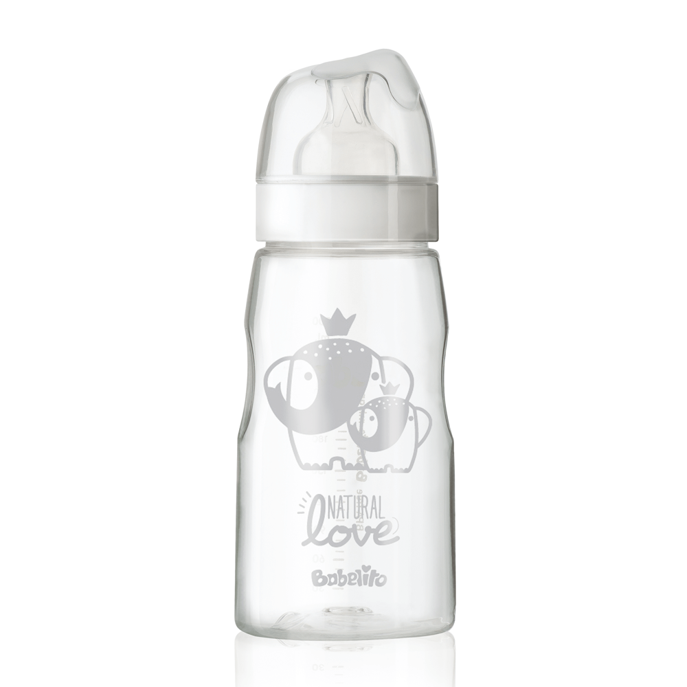 Biberón ultra-cristalino y de baja porosidad. El biberón viene con tetina de silicona boca ancha de flujo lento o medio (tamaños 1 y 2). Diseñamos esta tetina con válvula de aire en la base: el aire se direcciona hacia la válvula de ventilación e ingresa al biberón, provocando una salida constante de alimento, minimizando la ingesta de aire y reduciendo así, el riesgo de cólicos e hipo.