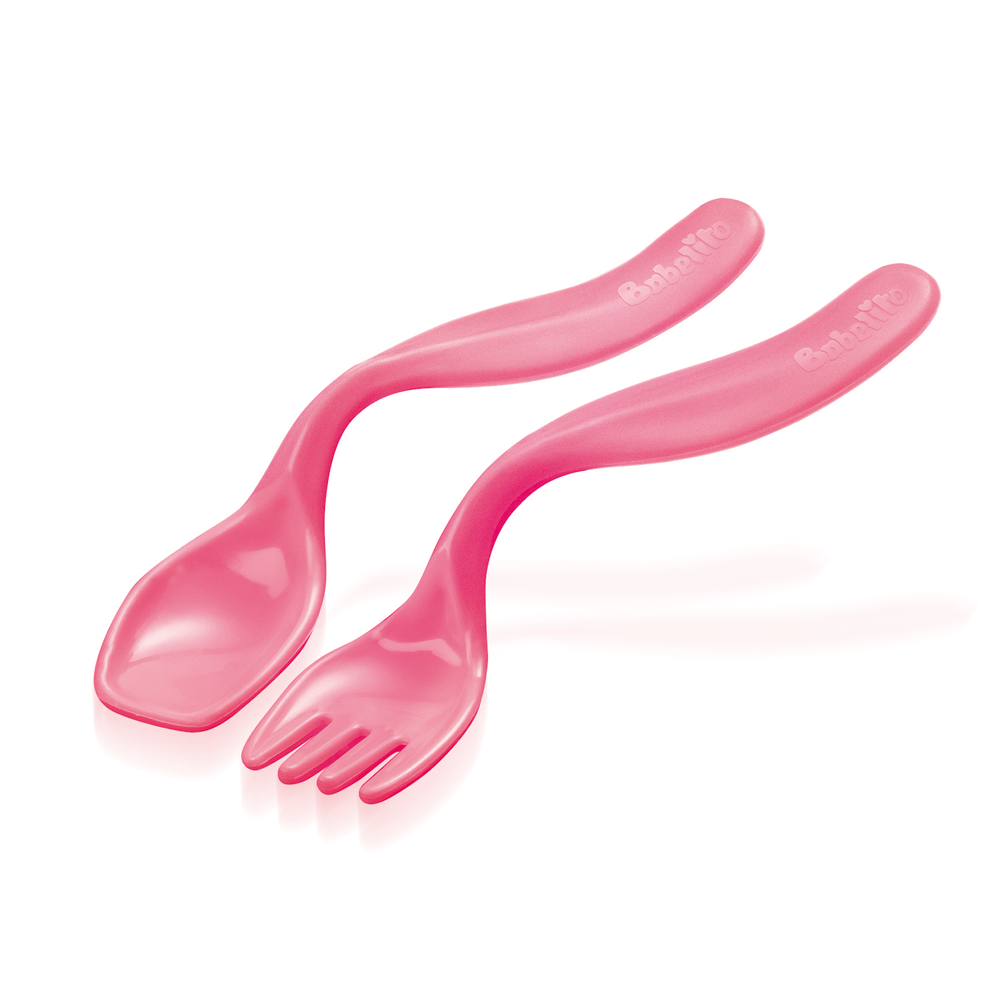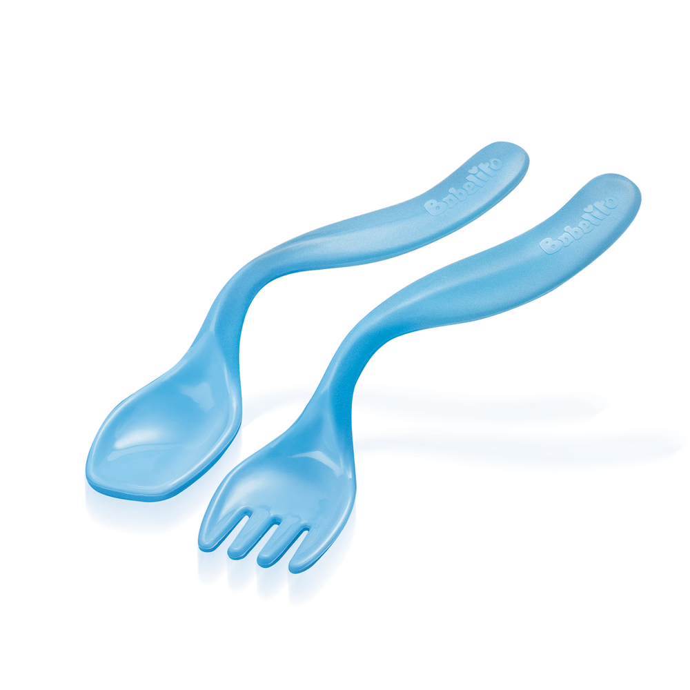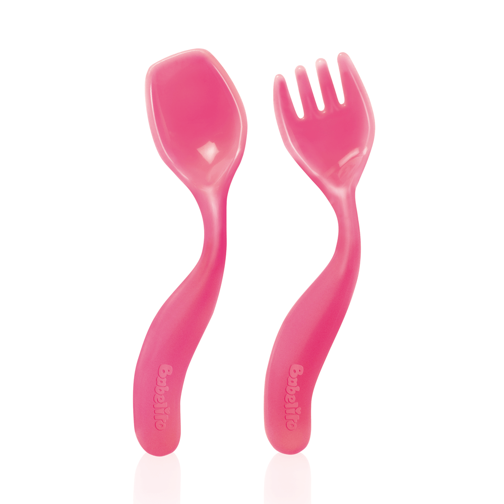 Nuestras cubiertos Babelito acompañan a tu bebé en las distintas etapas de su alimentación Juego de cuchara y tenedor en ángulo que ayudan al pequeño a llevarse sus primeros alimentos a la boca solito.